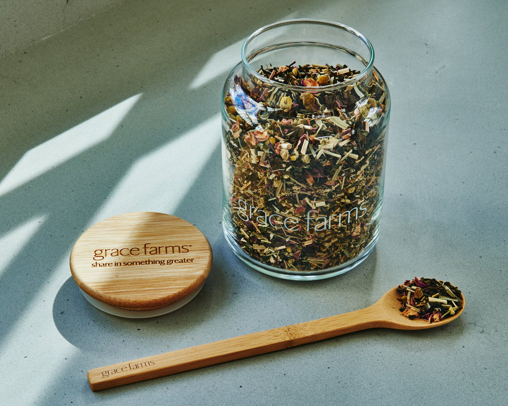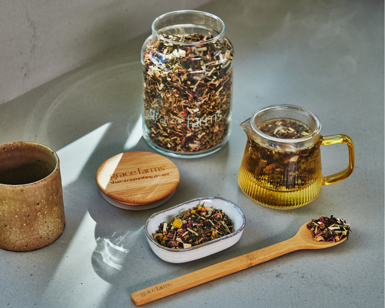 Create your loose leaf tea ritual with the complete set of Grace Farms tea wares and selection of two loose leaf teas.