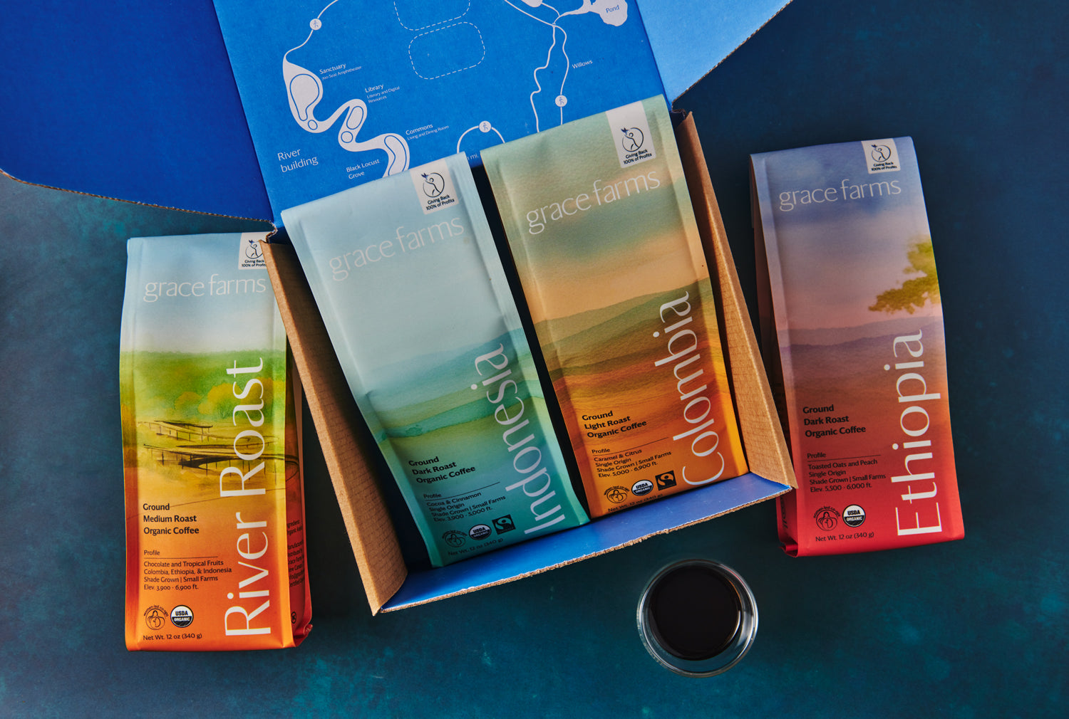 Treat the coffee enthusiast in your life to four bags of Grace Farms' signature whole bean coffee, sourced exclusively from women-run cooperatives. Each eye-catching gift set includes four 12 oz. bags boasting four distinctive roasts, including a Single Origin Colombia Light Roast, a Single Origin Ethiopia Medium-Light Roast, a Signature River Roast Medium Roast, and a Single Origin Indonesia Dark Roast.