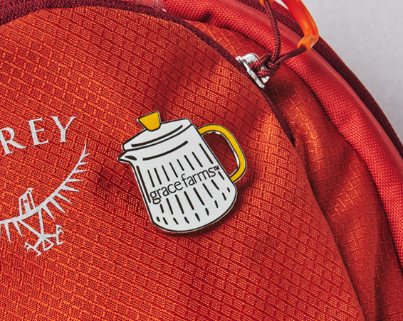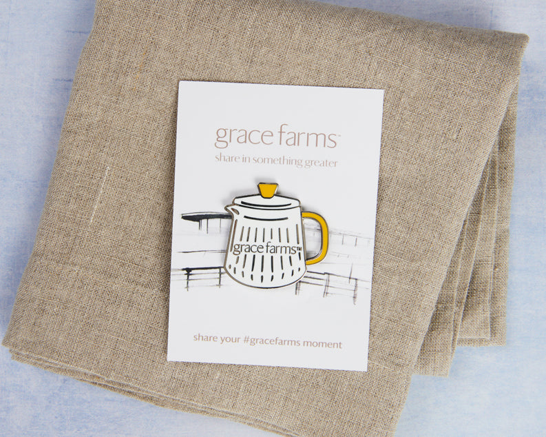 Share your love of tea with the Grace Farms Teapot Pin! This high-quality pin comes with double clasps for a secure hold, making it a perfect addition to any backpack or outfit. Share your love of tea in a fun and quirky way with this charming pin. It's a must-have for any tea enthusiast!